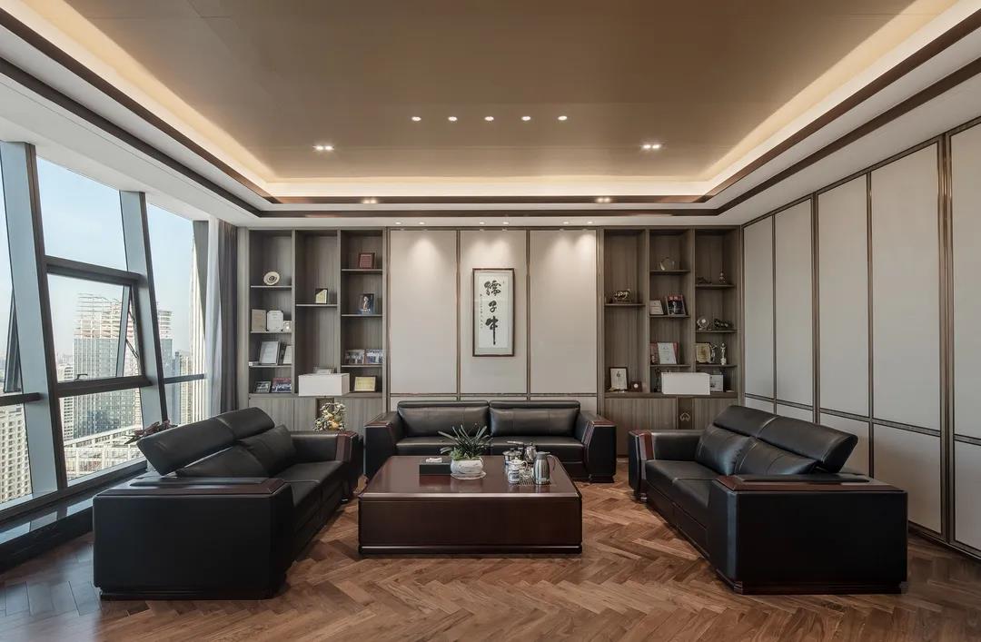 為保證安靜舒適的辦公環(huán)境,每個獨立辦公室的內(nèi)墻面均采用硬包吸音板,地面以褐色條紋地毯鋪貼,莊重又不失美觀。采用皮革、木飾面、雙層紙面石膏板跌級天花吊頂,在視覺上拔高空間,給人以開闊豁然之感,并放置了藝術(shù)玻璃屏風和丹青黑大理石洗手臺,大氣而典雅。