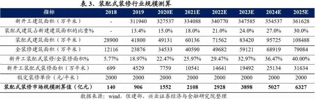 近日,興證研究發布裝配式裝修行業深度研究報告,測算2025年裝配式裝修市場規模將達到6327億元,年化復合增速為38.26%。保障房、長租公寓、租賃房、酒店等對裝配式裝修需求的穩中有升,成品住宅比例持續提升帶來的較大潛力,未來將催生裝配式裝修巨大市場空間。