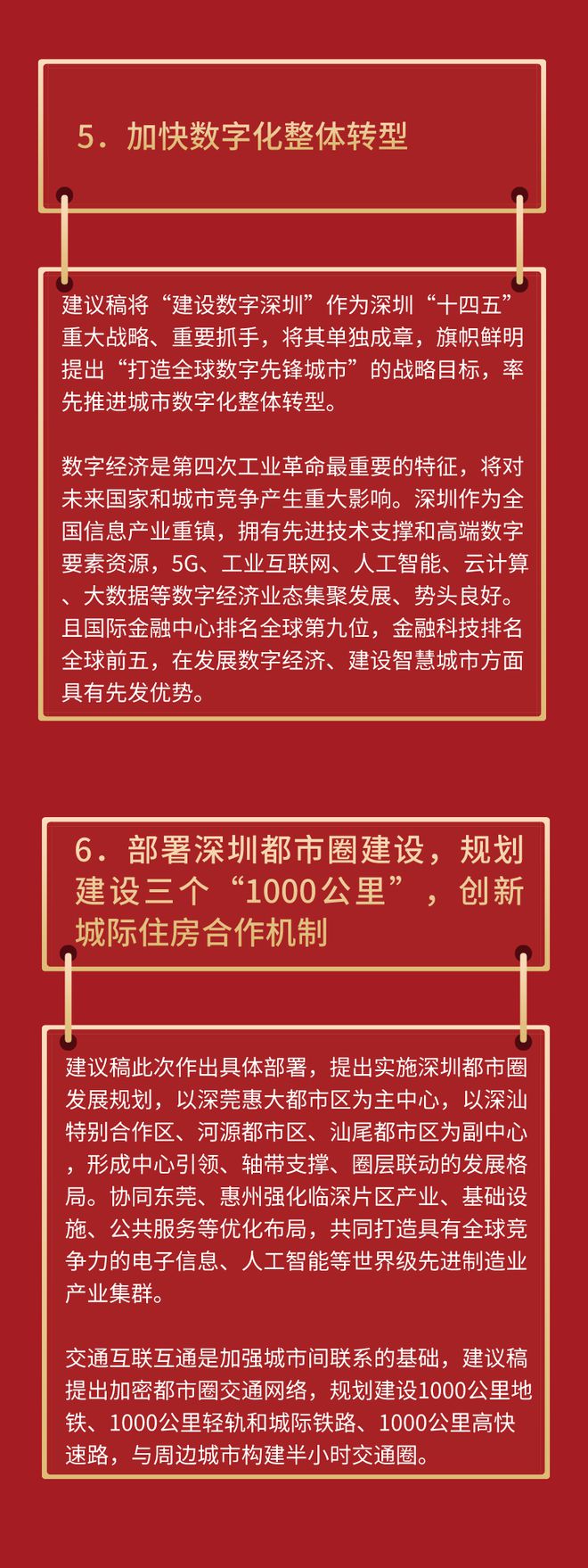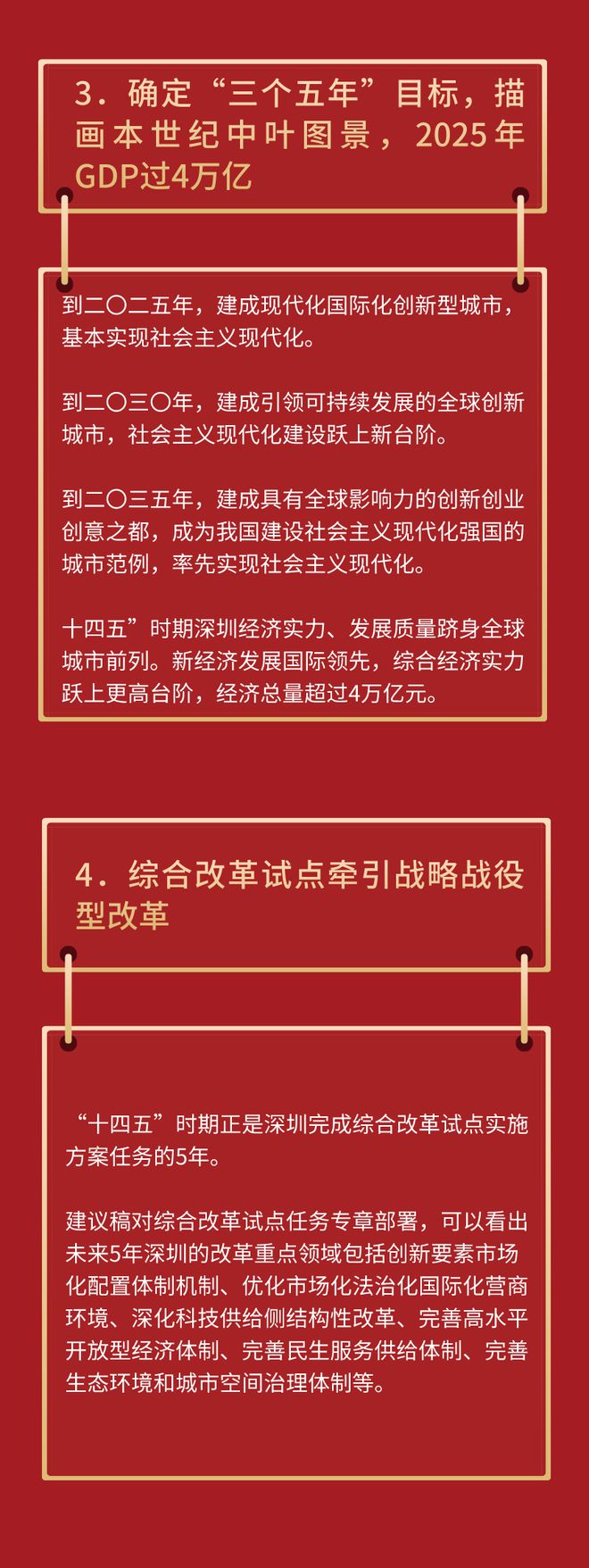 近日,《中共深圳市委關于制定深圳市國民經濟和社會發展第十四個五年規劃和二〇三五年遠景目標的建議》(以下簡稱“建議稿”)正式出爐,建議稿在結構上分3大板塊,共15個部分、73條,約2.7萬字,詳細闡述了深圳今后5年、10年乃至15年的經濟社會發展,信息量極大。