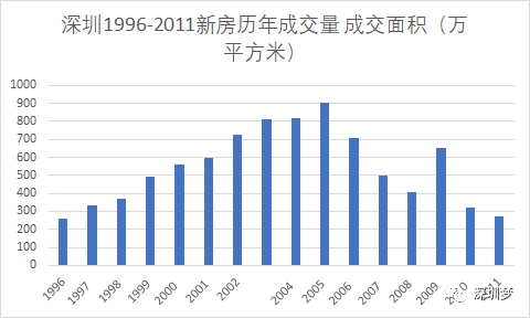 從數(shù)據(jù)來看,深圳2002-2006年成交量較大,分別為:724萬平方米、812萬平方米、 820萬平方米、901萬平方米、706萬平方米。