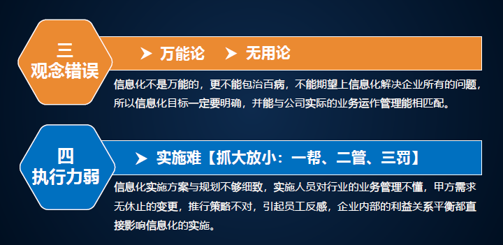 建筑施工企業信息化產品選型誤區。很多企業信息化又想做又害怕,我們總結了幾方面的問題,規劃錯誤,缺少頂層設計造成信息孤島。每一個部門買自己的。我們了解過一個企業有八套系統,都是獨立的,最后作為領導什么數據看的都是不一樣的。產品先型不對,越開發越累,要懂行的才能研究出來,如果找一個軟件,他什么都不懂,能給你研發出相關行業軟件嗎?不行,要選對。萬能論、無用論,軟件不是萬能的,也不是無用的,關鍵是怎么用。能實施好才是最主要的。對于信息化,不管花幾十萬、幾百萬、幾千萬,要落地,否則就打水漂了。信息化是請老師還是請學生?