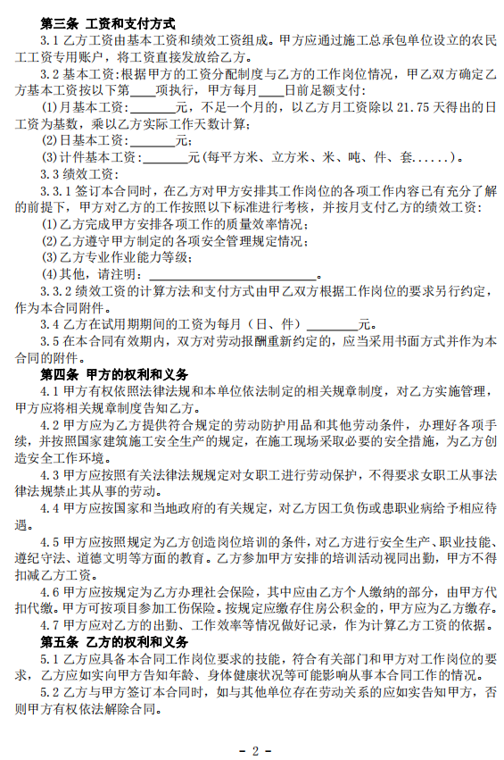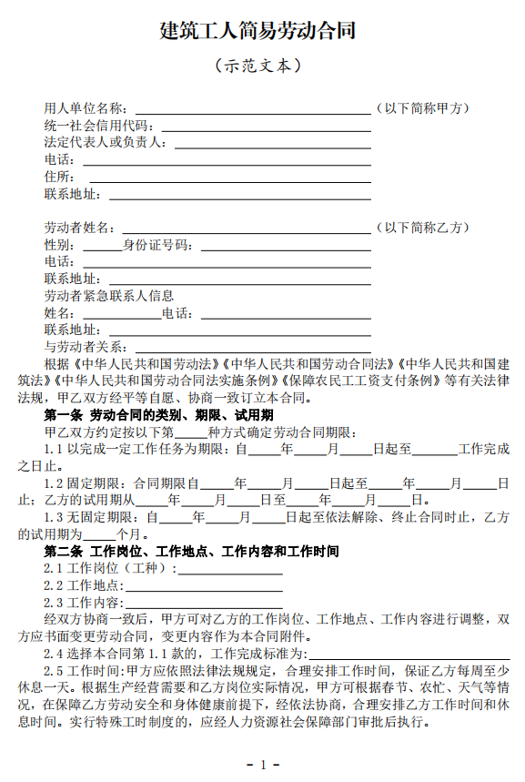 近日,住房和城鄉建設部辦公廳、人力資源社會保障部辦公廳印發《建筑工人簡易勞動合同(示范文本)》,范本具體如下: