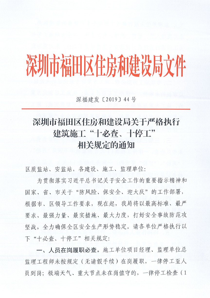 核心提示:8月21日,深圳市福田區住房和城鄉建設局發布了關于嚴格執行建筑施工“十必查、十停工”相關規定的通知,通知強調,各施工單位要以最高要求、最強力量、最實措施、最大力度做好安全事故防范,問題嚴重者一律停工整改至完成。