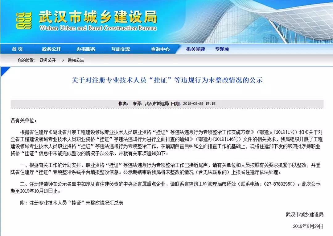 9月29日,武漢市住建局公示869人“掛證”未整改,其中包括802名注冊建造師、49名造價工程師、18名勘察設計注冊工程師/注冊建筑師。
